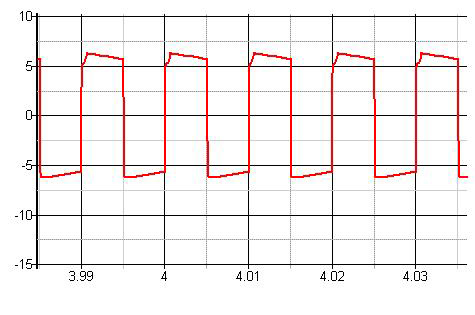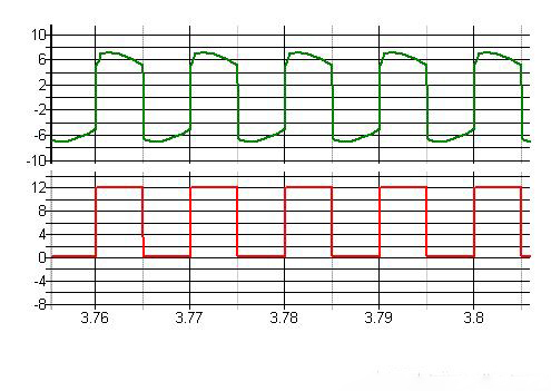 红色波形为驱动源V1的输出,绿色为Q1的G级波形。可以看到,Q1-G的波形为具有正负电压的方波,幅值6V了。