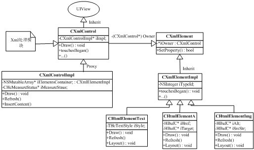 其中CXmlControl继承自UIView类,它负责显示界面并响应用户的按键消息,而具体的逻辑处理则是在CXmlControlImpl类中进行的,CXmlControlImpl这个类负责管理生成的tag(标签)以及tag(标签)的界面Layout(布局),如下: