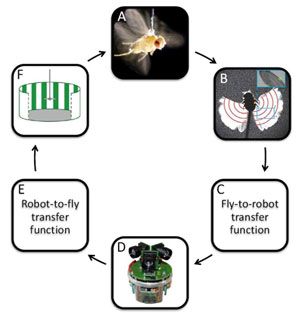 我们开发了一个试验。在试验中,我们把一只果蝇用绳拴住,通过果蝇的动作来控制伊普克(e-puck)机器人。该机器人是一个小型移动机器人,是一个大学的研究项目,它被设计用于通过充满障碍的环境。从绑定在机器人上的照相机和接近传感器可以获得反馈,用来确定向苍蝇展示的视觉刺激、翅振频率和幅度等飞行参数,来控制机器人运动(图1)。苍蝇和机器人之间的传递函数会发生变化,从而实现一系列的试验模式。