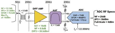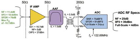图4是一个单端输入单端运放的例子,可以看到中频放大器、抗混叠滤波器、变压器和ADC四个级各自的信号增益,输入输出3阶截点功率,和引入噪声的系数等指标。单端信号利用无源变压器在ADC前转换为差分信号。这里要注意一下,假设ADC的终端匹配阻抗为200Ω,而由于前面各级都是50Ω的特征阻抗,所以将变压器的阻抗比设为1:4。