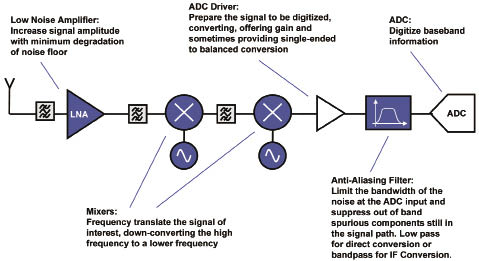 另一方面,在通信系统应用的时候,我们看到一个比较通用的超外差接收器的信号链,图1 为通用的超外差接收器的信号链,在天线后接一级低噪放大器,用于放大信号并抑制噪声,而后用两级混频器将信号下变频到较低频,其间我们会加入适当的滤波器,以滤除有用信号频带以外的噪音和谐波,之后就是驱动ADC的缓冲运放。这是我们今天主要讨论的问题。这一级运放的主要目的是调节信号的电平范围,提高驱动能力,有时候也要作为单端差分之间的转换。在进入ADC之前我们需要加抗混叠滤波器,最后是用ADC对基带信号进行模数转换。我们看到如果系统想实现较高的动态范围,除信号以外不能引入过多的噪声和谐波。
