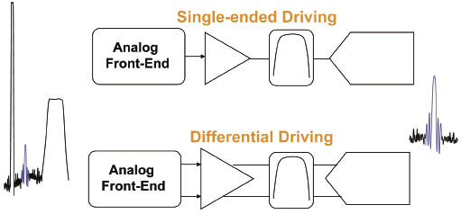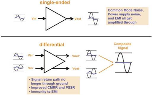 我们说差分信号链相对单端信号来讲有很多优势。由于是差模信号,输出的是两个差分信号,实际上输出的差模信号幅度相对扩大了一倍,换一个角度来讲,在同等输出范围条件下,工作电压会更低。这样,在要求低谐波失真的应用中,就可以保证足够的幅值余量。差分系统自身类似奇函数的特性可以消除系统中的偶次谐波项,也就是说2次、4次、6次谐波等,在这些频点上的谐波相对奇次谐波会很小甚至看不到。最后,由于信号的返回路径不再是地平面,信号受地平面或是电源平面影响不是那么敏感,从而减少了噪声的耦合引入,同时实现更好的抗电磁干扰效果。
