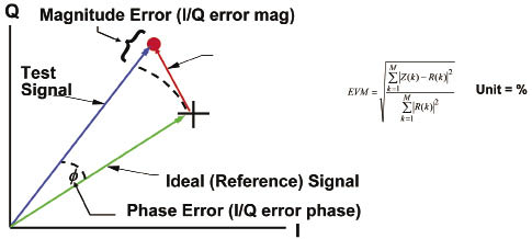 图6中我们可以看出接收系统中的噪声和谐波对误差向量幅度EVM的影响。也就是说,解调出来的信号相对理想的星座图位置会有所偏移,一般我们用误差向量幅度来衡量,过大的误差向量幅度会导致符号错误并恶化位出错率。特别在高阶调制方式时,符号之间的位置更近,对误差向量幅度的要求更严格。