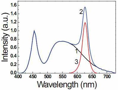 图2 光谱1,原始白光光谱;2,优化后白光光谱;3,加入的红光光谱