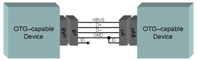 在标准 USB 中,主机上的插孔被称作“A”连接器,而外围设备上的插孔被称作“B” 连接器。由于目标终端设备主要为一些小型移动消费类电子产品,因此标准“A”插孔对这些产品来说过大。按照 OTG 规范的原始版本,这些新型连接器被称作“迷你”连接器。随后,对该规范进行了修改,以强制规定 OTG 设备的“微型”连接器。特别是,OTG 设备必须实施一个微型 AB 插孔。这种 AB 名命表示其为批量安装在某个单一设备中的“A”和“B”插孔。该微型 AB 插孔可以插接微型 B 插头或者微型 A 插头。问题似乎很清楚:如果您插一个微型 A 插头,则设备会为一个主机;如果您插一个微型 B 插头,则其为一个外围设备。但是,基于微型 AB 的产品如何知道插入的是什么呢?OTG 规范给标准 USB 系统的四个触点又增加了一个触点,称作 ID。由于 ID 引脚不在标准 USB 连接中,因此规范保留了这一点,并在 ID 引脚上定义了一个无连接,作为初始外围设备。反过来,如果 ID 引脚接地,则设备扮演初始主机角色,如图 1 所示。