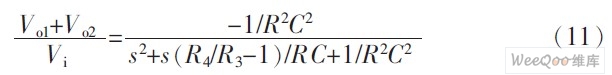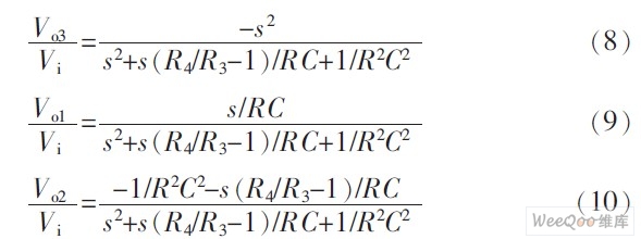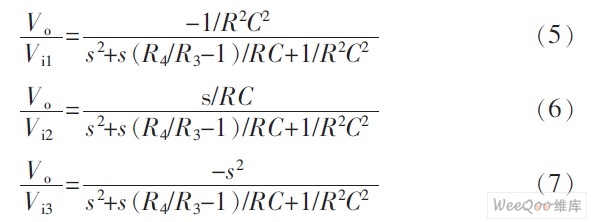 由式(8)、式(9)可知,若Vi3是输入,则Vo3是高通输出,Vo1是带通输出。式(10)、式(11)说明,Vo2并不是低通输出,当满足条件R4/R3-1=1时,Vo1+Vo2才是低通输出,这是一个值得注意的问题。所以图1电路也能从一个端口输入信号,从多个端口输出信号的双二次节,同时实现了高通、带通和低通二阶滤波。相应的增益常数分别为GB=-1,GB=Q,GL=-1。