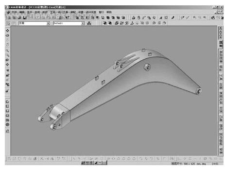 随着CAD应用软件和技术的不断发展,很多工程机械制造企业已不再满足于借助CAD系统来“甩掉图版”,希望向三维的实体设计方向发展。由于三维CAD系统具有可视化好、形象直观、设计效率高和支持并行工程等优点。因此,三维实体造型在液压挖掘机设计开发中开始得到的应用,在三维设计环境中可以进行挖掘机产品的模拟装配以获得整机或部件的三维实体,建立充分而完整的设计数据库,在此基础上进行产品质量特性分析、零部件间的干涉检查、自动创建二维工程图、机构运动仿真、产品结构的有限元分析、计算机辅助制造、商业广告造型与动画生成等。