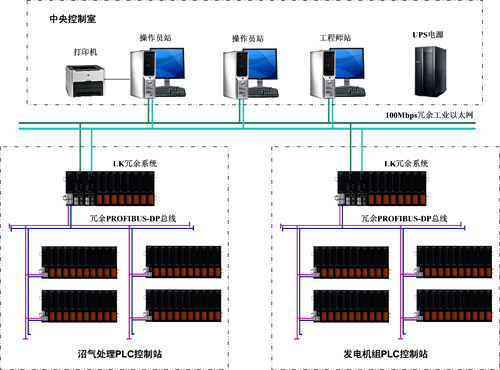 整个系统由1个中央控制室、2个现场PLC控制站(设于沼气处理系统、沼气发电系统)组成。现场PLC控制站,由HOLLiAS LK系列可编程序控制器(PLC)系统及检测仪表组成,对沼气发电各过程进行分散控制;再由中央控制室上位机实行集中监控管理。中央控制室上位机与PLC控制站之间的数据通讯采用高速的、实时的工业以太网,通讯速率为100Mbps,传输介质为屏蔽双绞线。