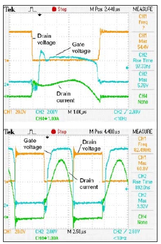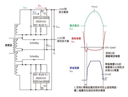 事实上,采用类比闸极电压驱动MOSFET的效率更高,如图2所示,其中:闸极电压随漏极电压或电流幅值的变化而改变。