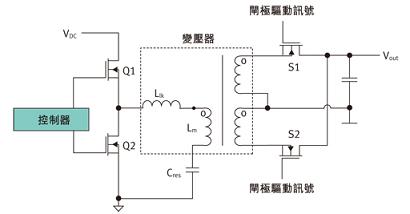 在中载和轻载条件下,图1中,由于谐振槽电压和电流的相移,无法使用初级侧的讯号驱动输出同步整流器S1和S2。在轻载条件下,转换器工作在谐振频率fr以上的区域,输出整流器电流变得不连续,且在谐振槽的电压和电流间存在相差。