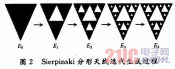 Sierpinski三角形是由波兰数学家Sierpinski提出的一种分形结构,图2显示了使用迭代函数系统(IFS)构造Sierpinski分形天线的过程,它的分形维数为:D=In 3/In 2=1.58。