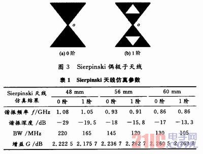 对于Sierpinski分形天线,这里研究了角度均为600,比例因子均为0.5时,三角形的边长分别为48 mm,56 mm,60 mm时,基于0阶和1阶的偶极子天线性能。天线结构如图3所示。利用HFSS 11.0进行仿真,其中1阶分形结构仅列出低频谐振频率,仿真结果如表1所示。