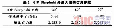 对于0阶Sierpinski分形天线而言,其实它就是两块三角形的平板,三角形板型天线为宽频带天线,这里研究当其两条边相同,但其所夹角不同时,天线 的性能。天线的边长为60 mm时,所夹角分别为30°,60°,90°,由HFSS 11.O仿真得其天线性能如表2所示。