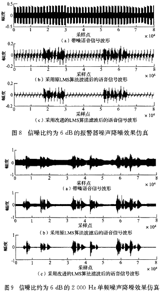 图7、8分别为信噪比约9dB、6dB报警器噪声降噪效果仿真图,图9、10分别为信噪比约9 dB、6 dB的2 000 Hz单频干扰噪声降噪效果仿真图。由图可以看出,报警器噪声和2 000 Hz单频干扰噪声也得到了大幅度的抑制,信噪比提高约10 dB以上,采用改进的算法比原算法噪声抑制得更大,降噪效果更好;由于窄带噪声频率成分比宽带噪声简单得多,自适应算法可以更快地收敛,所以可把噪声滤除得比较干净;在听觉效果上,此算法提高了语音的清晰度和可懂度,很好地保持了语音的自然度,失真很小,对听觉的影响可忽略不计。