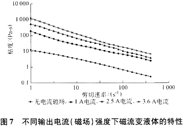 图7给出不同电流(磁场)强度下用粘度仪测量自制磁流变液体的机械特性。当在3.6 A电流下,磁流变液体的粘度比无电流时增加至少2个数量级。