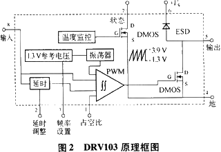 美国TExAs仪器公司专为驱动继电器、电磁线圈、电动执行机构、加热器及照明优化设计生产了PWM集成芯片系列,DRV103是其中之一,其尺寸为5 mm×6 mm,可调延时时间、可调振荡频率、可调占空比及价格低,使它广泛适用于各种场合。DRV103有开关驱动和连续驱动两种工作方式。DRV103能够设置为原始封闭模式,在这个模式下,能够自动地切换到省电方式。图2显示DRV103的简略框图及引脚。