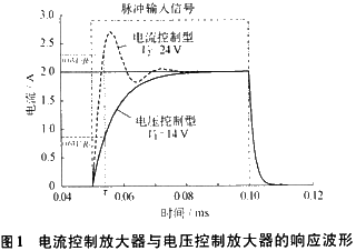 电磁线圈的电流控制方法通常有电压控制和电流控制两种。电压控制法是调节线圈的端电压来控制通过电磁线圈的电流;电流控制法是在全额电压下改变电磁线圈的电流大小。由于负载变化,例如线圈电阻由于温度而变化,仅调控电压会带来电流误差。磁场强度正比于电流大小,而且阻尼缸要求反应很快。假定一个负载电阻是5 Ω,某时刻该负载需要1 A电流,对于电压控制型放大器,此时需要负载电压控制为5 V。对于电流控制型放大器,此时负载电压可能是12 V或更高,在一个信号脉冲输入的一瞬间,负载电流将超出1 A,然后回复到1 A。电流上升波形如图1所示。同样的线圈电流下,电流控制型放大器的电流上升时间明显小于电压控制型放大器的上升时间。这是由于全额电压下,电流型放大器能更快通过线圈,而且电流型放大器容易实现电流补偿。撤消信号脉冲后,两种类型的放大器波形基本重合,这是由于线圈放电成指数衰减的缘故。