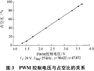 考虑到许多新的D/A转换器不具有灌电流能力,而且D/A的输出通常是0 V~+10 V,若直接将D/A接入脚1,将会出现大的死区,除非在软件编程上做分隔。为了方便使用,需要对占空比输入控制电压作一线性变换。根据图3,设PWM调节方程为: