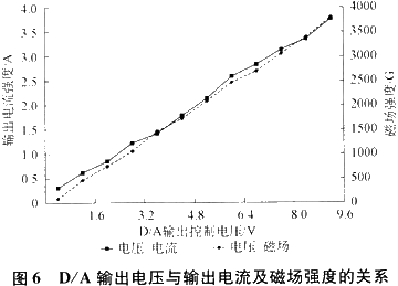 采用本电流放大器驱动电磁铁OP2025(其内阻为3.5 Ω),GM04高斯表用来测量电磁铁OP2025的磁场强度,D/A输出电压与输出电流及磁场强度的关系测量结果如图6所示,其线性同归误差为±1%,当D/A输出为10 V时,占空比为1 00%,功率场效应管全开通,电源电压加在负载上,显示出良好控制效果。