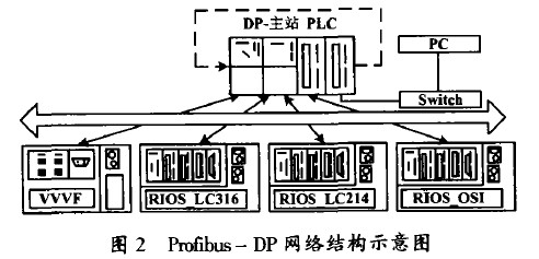 一个完整的Profibus—DP网络由以下几部分组成(图2):主控器(PLC);现场I/O模块(ET200),用于连接各种现场装置;其他智能装置,如变频器、触摸屏等;网络附件(交换机等)。它能够直接完成设备的顺序、联锁、闭环控制,实现过程参数的采集以及报警功能。