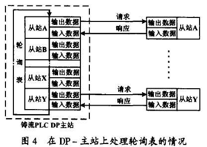 主站为(CPU417—4DP,从站为ET一200。主站与从站间的通信基于主一从原理,主站负责在预定的信息周期内循环与从站交换信息,在总线上向从站发送数据并向从站读取数据,只有当主站Strand PLC请求时总线上的DP从站才可能活动,才能与主站进行数据交换。也就是说,DP从站被DP主站按轮询表依次访问,主站与从站间的用户数据连续地交换而不考虑用户数据的内容。图4指出在DP主站上是怎样处理轮询表的。主站与从站间的一个报文循环由DP主站发出的请求帧(轮询报文)和由DP从站返回的有关应答或响应帧组成。