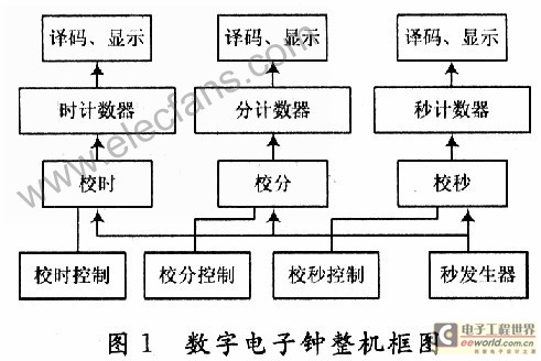 数字电子钟主要由秒信号发生器、“时、分、秒”计数器、译码显示器、校时电路等组成。秒信号发生器主要由石英晶体振荡器或555振荡器分频后得到;秒、分都是60进制,故由60进制计数器构成;时为24进制,即由24进制计数器构成;显示部分由译码和数码显示构成;校时电路由门电路和开关等构成。整机框图如图1所示。