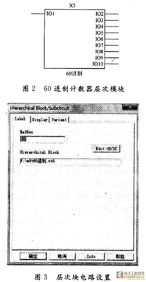 秒、分计数采用60进制计数器,时采用24进制计数器。它们都是8个BCD码输出,1个进位输出,1个时钟脉冲输入。在设计层次电路时,皆可设计为1个输入端,9个输出端。在Multisim仿真软件中,执行Place/New Hierachical Block命令,在fiIe name of Hierachical Block中填入你要设计的电路名称,如“60进制计数器”等,再根据需要在输入、输出端口数中填写所需数字,点“OK”后,即得如图2所示电路层次模块。双击它,得到图3所示窗口,点Edit HB/SC对其内电路进行设计。若要进行修改,同样采用以上步骤。