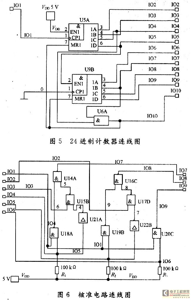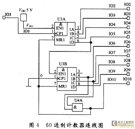 由此,采用4518十进制计数器,设计了60进制和24进制的计数器,计数器的内部电路分别如图4、图5所示。