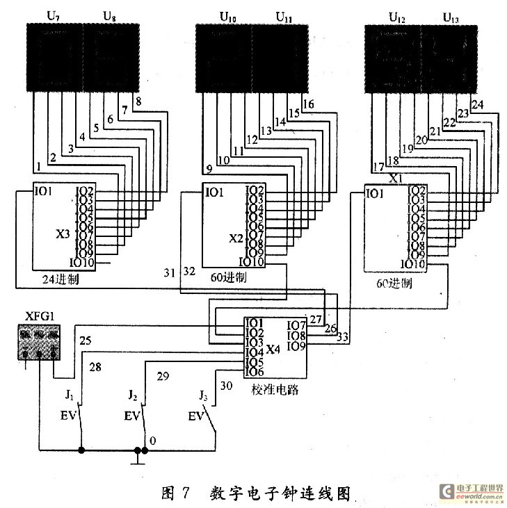为使各电路接线后能顺利工作,对各层次块可以先分别测试其功能。将信号发生器分别接入60进制和24进制计数器层次块,其输出接数码管或示波器看其是否能完成其功能。对其校准电路,只有当整机电路接好后,按校准电路所说工作方式,看是否能起到时、分、秒的校准。本例中各模块皆能完成其功能,接好整机电路后,能完成所需功能,故本例数字电子钟满足设计任务。