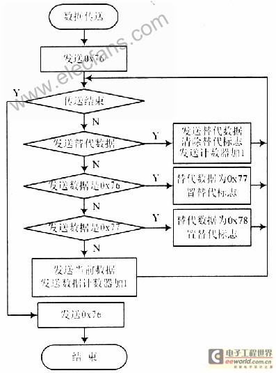 在通信协议中采用Ox76(0x表示16进制计数)作为帧标识符。为了保证帧标识符的惟一性,对帧内容中的Ox76采用了替代算法,使帧中的内容不再出现Ox76,解决了接收端的同步问题,亦可提高接收的可靠性。如果发送的数据为0x76,则用Ox77,Ox77两个字节替代;如果发送的数据为Ox77,则用Ox77,0x78两个字节替代。算法流程如图2所示。