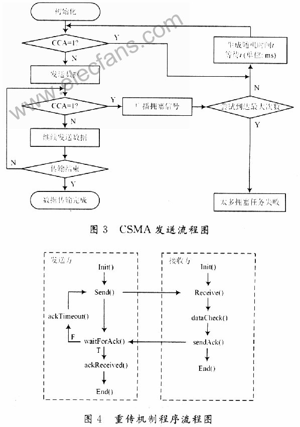重传机制主要采用ACK(acknowledge)方式,即发送方为发送的每一数据包设置缓存和相应的重发定时器,若在定时器超时之前收到来自目的节点对此数据包的ACK控制包,则认为此数据包已经成功地传送。此时,取消对该数据包的缓存和定时,否则,将重发此数据包,并重新设置定时器。对于每个数据包,接收方都需要反馈ACK。