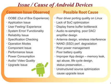 尽管Android系统的普及看似指日可待,但在实际的产品应用上,也有其可能产生的问题风险。Android作为一个开放式的操作系统,是Google提供厂商的操作系统参考架构(reference design),厂商能有充足的发挥空间,以Android为基础向上开发设计自家产品,但也因为这样的开放性与自由性,让厂商在软硬件结合的这个环节必须下更大的功夫,像是如何挑选合适的硬件包括基频处理器、通信芯片、触控感应芯片、天线与存储器模组等,以及如何调整出最适当的软件设定等,更重要的是如何将软硬件整合,开发出差异化的产品。这中间所有的细节都会对产品最终样貌产生莫大的影响,像是其功能的完整度、使用接口的设计、效能表现(例如触控滑动画面、开启程序所需时间)、品质可靠度、甚至是后续的固件升级动作等等。在此百佳泰便试图以专业中立的测试实验室角度,来点出厂商应用Android于手机、平板电脑或其他设备时应注意的开发重点,以希冀作为一个有效的参考资讯。