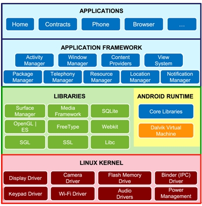 ·Android执行环境(Android Runtime):透过Core Libraries(核心函式库)以及暂存器型态的Dalvik Virtual Machine(Dalvik虚拟机器)来执行程序。