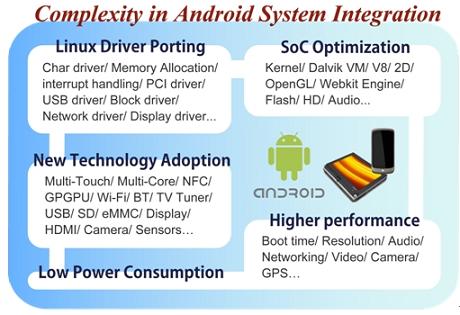 对厂商而言,开发一款Android设备,不仅仅只是将所有零组件组合成为一个产品那么容易,最大的学问便在于将系统单芯片(System-on-a-chip,SoC)、各种新技术和Android系统进行整合,SoC涉及像是Dalvik Virtual Machine、OpenGL、V8、Webkit Engine等上层的演算,与Android间的结合便必须透过不断的尝试与验证,才能研发出既符合成本效益、又有良好效能的优化产品。目前市面上有些SoC厂商已针对Android系统的特性,提供整合过的SoC平台,将蓝牙、相机或上网等常用功能模组预先写入,减少终端成品厂商费力整合开发的时间,但对厂商而言,这样的预先整合是否适合自身产品,以及是否需要再作更细致的修改,则又是更困难的课题。