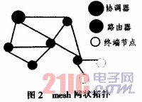 ZigBee技术是一种应用于短距离、低速率下的网络拓扑技术,是基于IEEE 802.15.4无线标准研制开发的。在PHY层,其频段是免费开放的,国内主要应用于2.4 GHz频段,传输距离大约100 m,传输速率大约是250 Kb/s,各个频段均采用直接序列扩频技术。为了避免其他无线通信干扰,采用碰撞避免机制,同时为需要固定带宽的通信业务预留专用时隙,避免了发送数据时的竞争和冲突。ZigBee提供了数据完整性检查功能,具有加密功能,加密算法采用通用的AES-128加密算法。本文采用以CC2430为内核的ZigBee模块,CC2430集成了RF射频模块与加强型的51模块。CC2430有低功耗模式,在没有数据发送的时候,前端节点进入休眠状态,此时的耗电量仅为几十微瓦。有中断挂起时能够很快地传输数据。针对小区的智能安防建设,采用mesh状的拓扑结构,拓扑结构模型如图2所示。Mesh拓扑结构具有自愈能力,安全性和可靠性高,其中的一个节点发生故障时不会影响整个系统工作。可以通过其他冗余路由传输给中心协调器(基站),从而能够使中心协调器有效地发送控制命令。