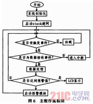 主程序流程主要是MCU进行数据初始化,启动stack组建网络,当网络组建成功后等待其他节点加入网络。如果没有事件触发,系统则进入休眠省电状态;如果有触发事件发生,则进一步判断是否是数据接收事件。如果不是数据触发事件,则进入相应的中断程序进行处理;如果是数据接收事件触发,则进行数据处理诊断,转化成标准的气体浓度,然后通过LCD显示模块显示出来。判断是否达到浓度的预警值,如果达到预警值,则启动语音模块报警。报警结束后继续进入等待事件状态。