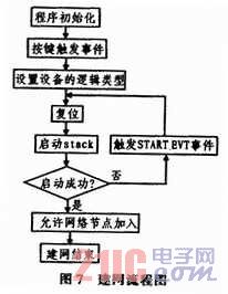 组建网络的流程图主要是系统设置初始化,通过按键来设置设备的逻辑类型,然后进行系统复位,复位后启动协议栈,判断协议栈是否启动成功,如果启动失败,触发START_EVT事件继续启动协议栈,直到协议栈启动成功,然后把协调器设置成允许其他节点自动加入网络,则建网成功。具体建网流程图如图7所示。