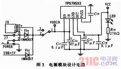 电源模块主要是由TPS79533低压稳压器输出3.3 V电压,其输入电压范围是2.7~5.5 V,并具有较高的电源抑制比、超低噪声、较好的电压线性和负载瞬态效应以及较小的电压漂移。其具体电路如图3所示。