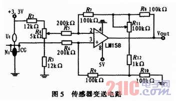 TGS6812由易燃气体敏感的元件D和对易燃气体不敏感的基准元件C组成。当可燃气体存在时,将在D检测元件上燃烧,造成温度上升,D元件的电阻将会增加,从而使输出电压相应被改变。测量这个电压值,通过计算可以求得可燃气体的浓度。当在空气中时,受到环境温度的影响,传感器也会有零点输出,所以应用LM158设计差动增益可调的放大电路来抑制零点漂移,具体设计电路如图5所示。