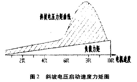 电压斜坡软启动器从零开始以线性斜坡增加电机端电压,直至额定电压。它是将传统的有级降压为无级,启动时间可调。这种启动方式缺点是启动转矩较小,转矩特性呈抛物线上升对拖动系统不利,且当电压斜坡升至额定电压时,如果电机仍未达到额定转速,电机将以全电压提供启动电流直至达到额定转速。见图1、图2。