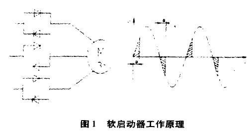 软启动器由串接于电源与被控电机之间的三相反并联晶闸管及其电子控制电路构成。控制晶闸管组的导通角,调节施加在电机上的电压,以实现软启动和软停止的功能。其工作原理如图1。