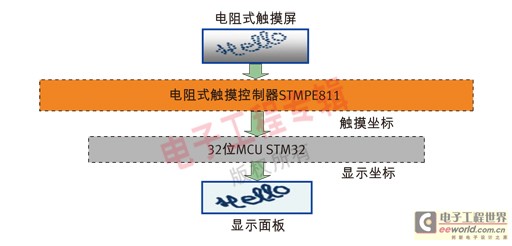 为了弄明白电阻式触感解决方案的原理,我们分析一个现成的低成本手写板解决方案(图 4)。在这个实例中,电阻触摸屏控制器采用ST的先进STMPE811控制器,主处理器采用ST的STM32高密度32位微控制器。