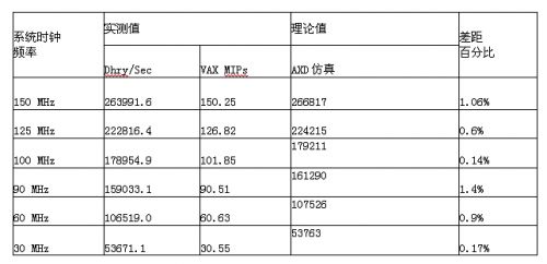 由于我们对芯片的总线、内部存储器进行了优化,为了证实此优化效果。我们对于芯片的最高运算能力进行了基准测试。我们的测试程序使用的是ARM公司提供的参考测试程序Dhrystone2.1(C语言编写),以性能最优的方式进行编译。该测试程序在芯片的内部SRAM中运行。下表是我们的测试结果以及与软件仿真测试结果的比较。可以看到,我们的芯片在最高性能时的执行效率已经基本达到了ARM7TDMI的最好的指标,这也说明,我们的设计是非常优化的。