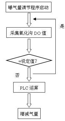 曝气供氧系统是由鼓风机、电动调节阀和溶解氧仪共同组成的闭环系统,为反应池好氧段提供氧气,并维持好氧过程的溶解氧浓度值。依照好氧过程的溶解氧浓度值控制鼓风机的开启程度,维持溶解氧浓度值在一定的范围内变动。控制流程如(图五)。