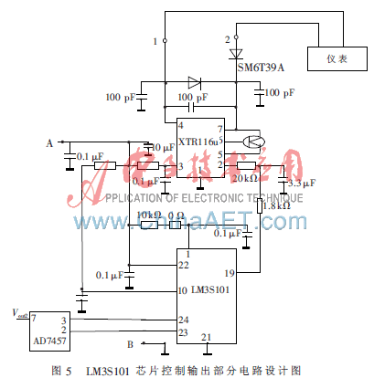 如图5所示,XTR116u是4 mA~20 mA电流环路发送器,可以传送模拟4 mA~20 mA电流信号,符合工业电流环的标准;可提供精确电流刻度,并具有限定输出电流的功能。A和B为供电电压,由AD620放大后的电压信号VOUT2接入AD7457的管脚7,再由AD7457转换成数字信号,送入LM3S101芯片24管脚处,经LM3S101芯片数据处理后,由19管脚输出。XTR116u将LM3S101芯片处理后的信号转化成标准的4 mA~20 mA电流,由1和2两线输出,最后将1和2两线接入到仪表,并由仪表显示。