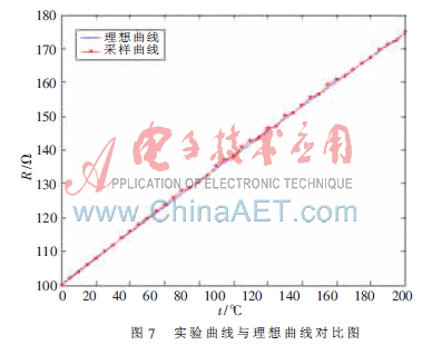 实验中,取0~200℃之间的理想曲线,将式(3)迭代函数在Matlab中编程,得到理想曲线;在0~200℃之间,每隔5℃取一采样值,与理想阻值比较,并将采样点连接。实验结果如图7所示。由图可以看出,采样所得曲线与理想曲线基本吻合,精确度高。