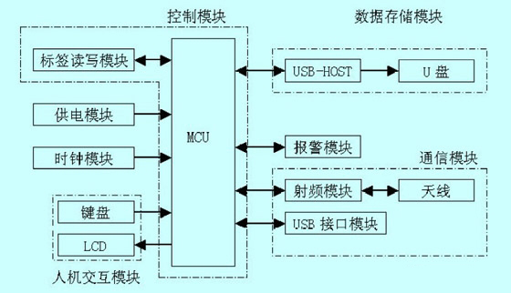 便携式阅读器在RFID 系统中主要功能是从电子标签中读取数据,并先将采集的数据处理后暂时存储在数据存储模块的U 盘中,然后把U 盘插入计算机,RFID 管理系统再从U 盘中读取采集的数据。便携式阅读器的硬件组成主要有控制模块、数据存储模块、通信模块、人机交互模块、时钟模块、供电模块等。硬件系统的构成如图1 所示。