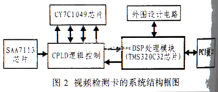 图1所示的测试系统的主要任务是采用DSP芯片处理通过摄像头拍摄并经过A/D转换的图像。整个系统由视频解码器、DSP和PCI总线专用芯片组成。系统通过PCI总线同通信平台交换数据,同时通过网络进行检测控制,图1所示是其系统框图。 2 关键设计及器件选择 本系统设计的关键是视频处理卡的设计,一般的视频检测卡功能有限,不能满足本项目的需求,为此,笔者自行设计了一块视频检测卡。其结构框图如图2所示。