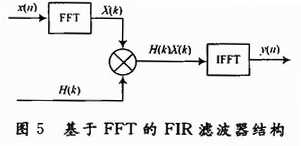 应用快速傅里叶变换(fast fourier transform,FFT)实现FIR滤波器是一种快速实现滤波算法的重要途径。由式(1)可知,FIR滤波器的输出y(n)是输入x(n)与系统冲击响应序列h(n)的卷积,应用FFT可以快速实现卷积变换。如图5所示,先将输入信号x(n)通过FFT变换为它的频谱采样值X(k),然后再与FIR滤波器的频响采样值H(k)相乘,H(k)可事先存放在存储器中,最后再将乘积X(k)H(k)通过快速傅里叶反变换(IF-FT)还原为时域序列,即得到输出y(n)。
