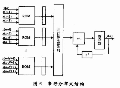 (1)第一种结构为串行分布式结构。串行分布式FIR滤波器的原理为,首先用所有N个输入量的最低位对DA查找表进行寻址查值,得到一个部分积,将部分积右移一位即相当于除以2后放到寄存器中暂存。同时,N个输入量的次低位开始对DA查找表进行寻址查值,得到另一个部分积,把该部分积与上一个储存在寄存器中的值进行相加,相加后的值再右移一位放到寄存器中。以此重复循环累加,直到所有位数都寻址完
